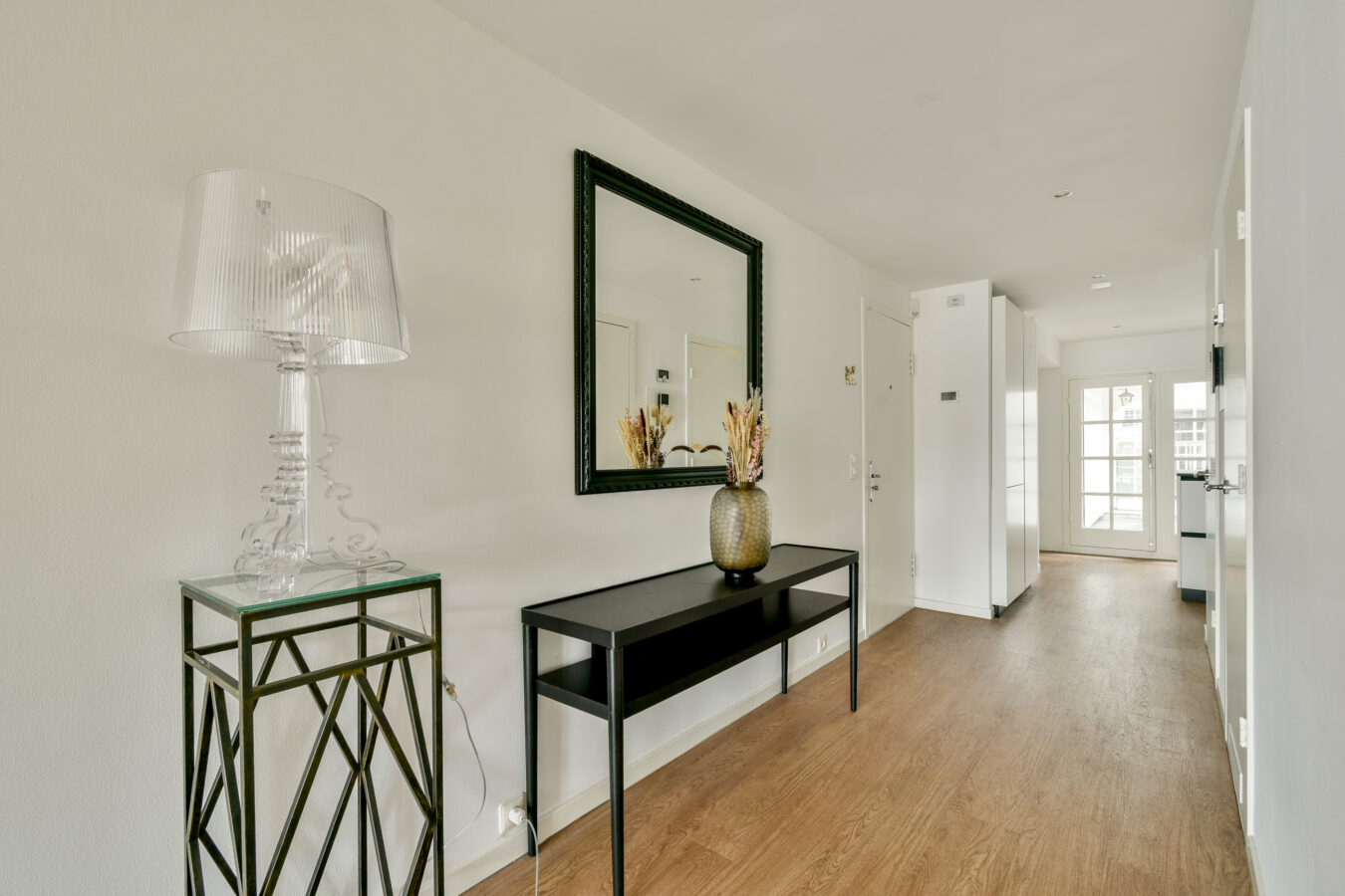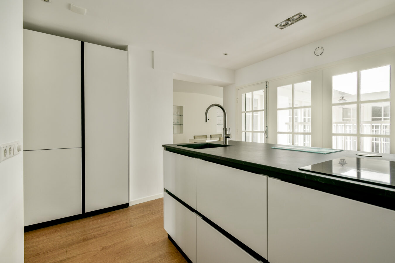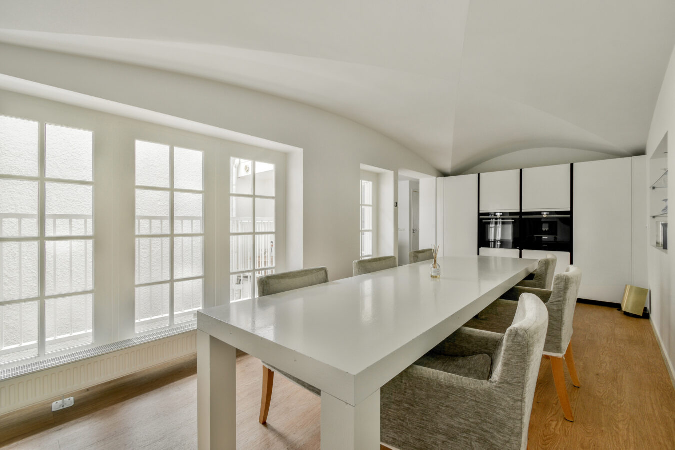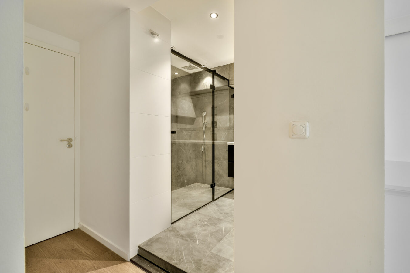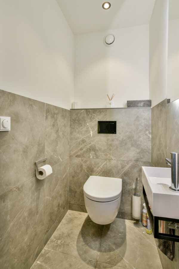 Aangrenzend bevindt zich een berging met ruimte voor wasmachine, droger en de cv-installatie, evenals extra opbergruimte. Het gastentoilet met fontein is stijlvol afgewerkt. De semi-open keuken is voorzien van moderne apparatuur, waaronder een quooker, inductiekookplaat, vaatwasser en koel-vriescombinatie. Vanuit de keuken heeft u toegang tot het balkon, dat ook grenst aan de ruime eetkamer.