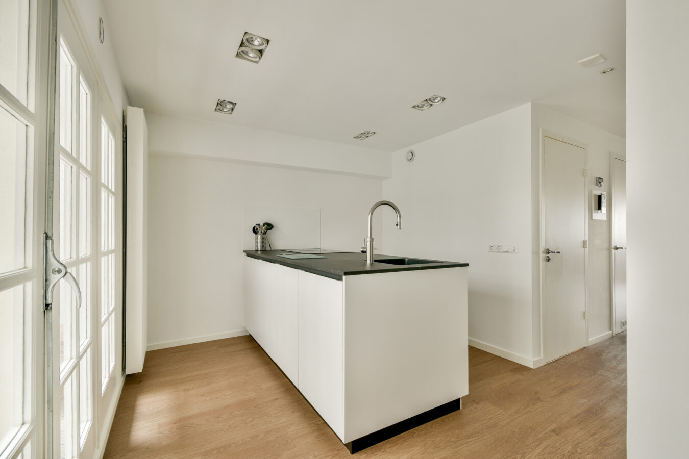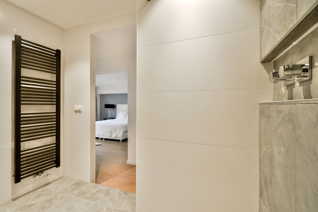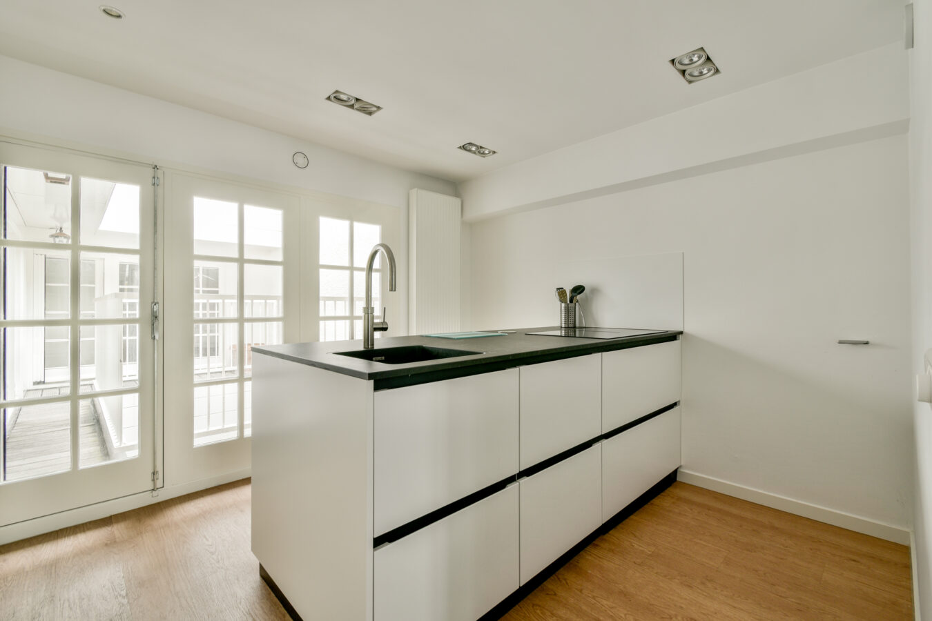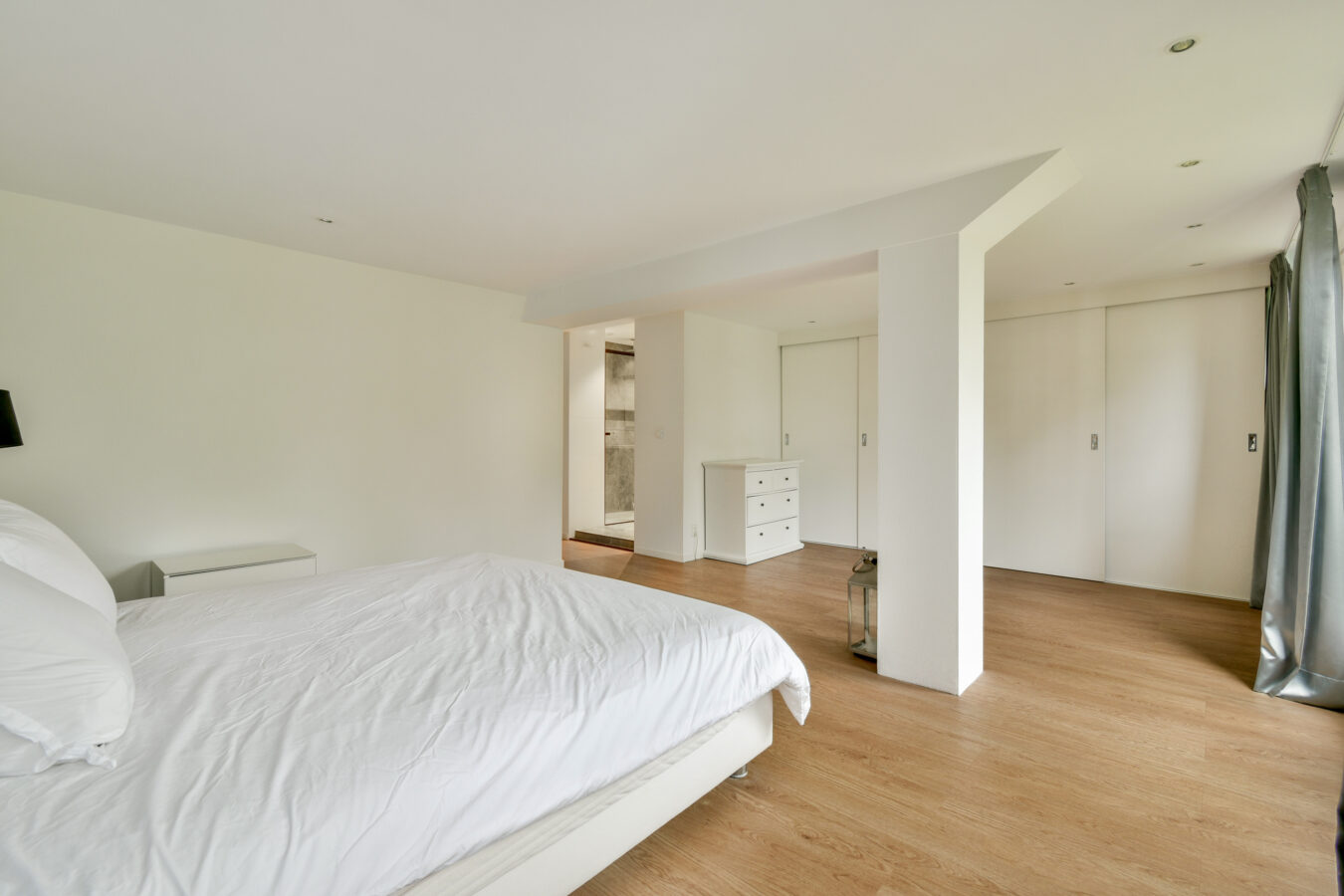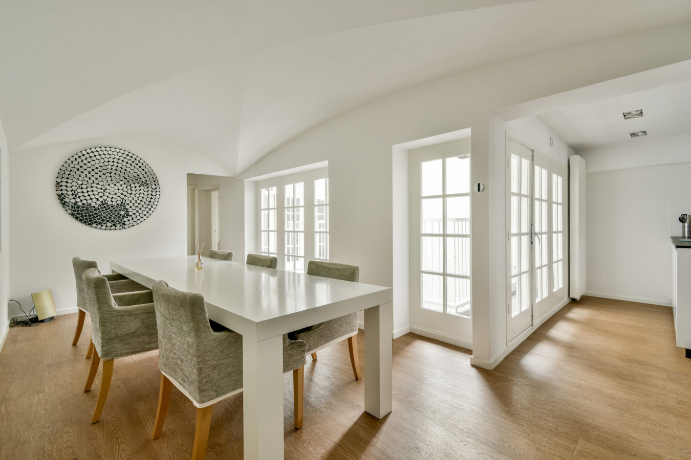 Aangrenzend bevindt zich een berging met ruimte voor wasmachine, droger en de cv-installatie, evenals extra opbergruimte. Het gastentoilet met fontein is stijlvol afgewerkt. De semi-open keuken is voorzien van moderne apparatuur, waaronder een quooker, inductiekookplaat, vaatwasser en koel-vriescombinatie. Vanuit de keuken heeft u toegang tot het balkon, dat ook grenst aan de ruime eetkamer.