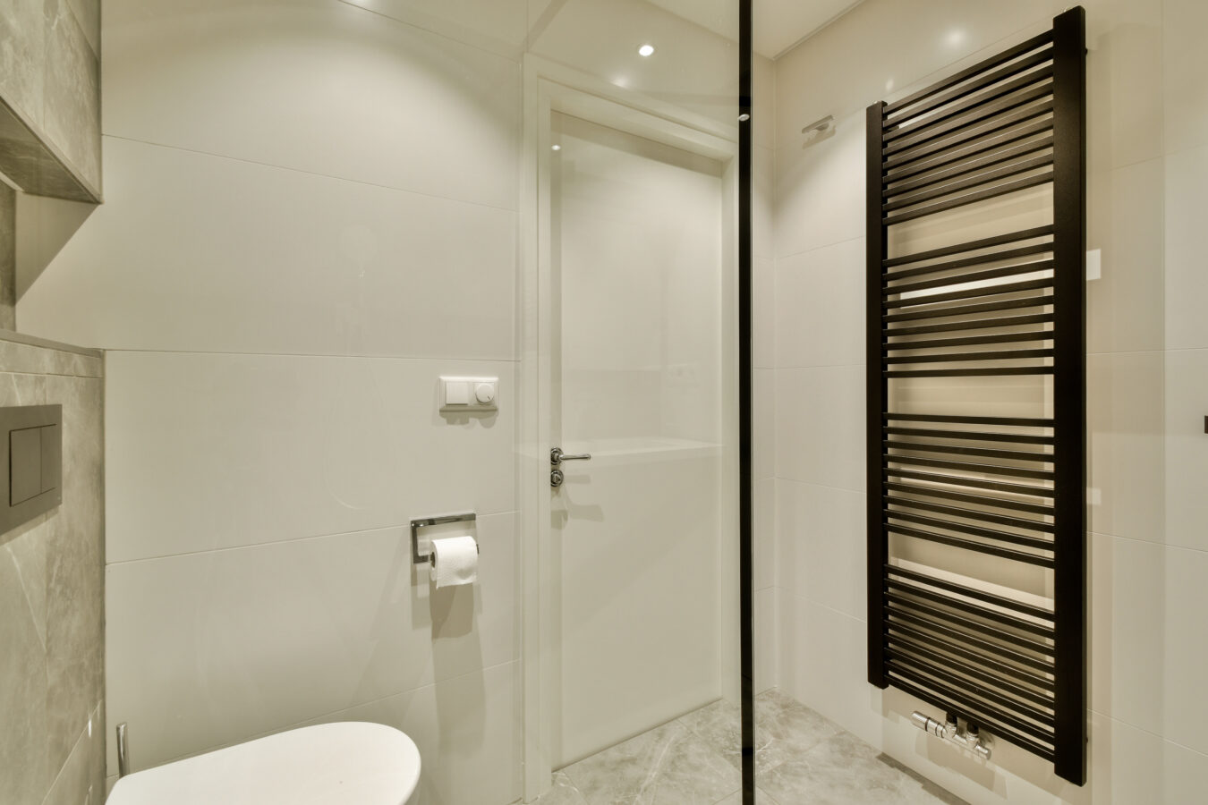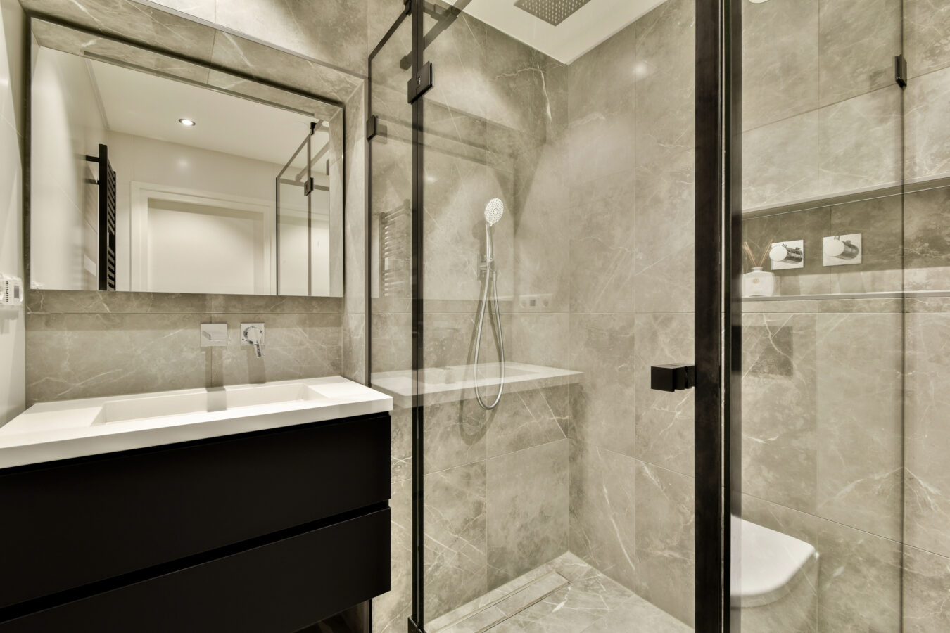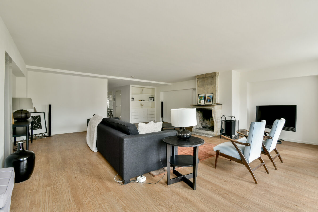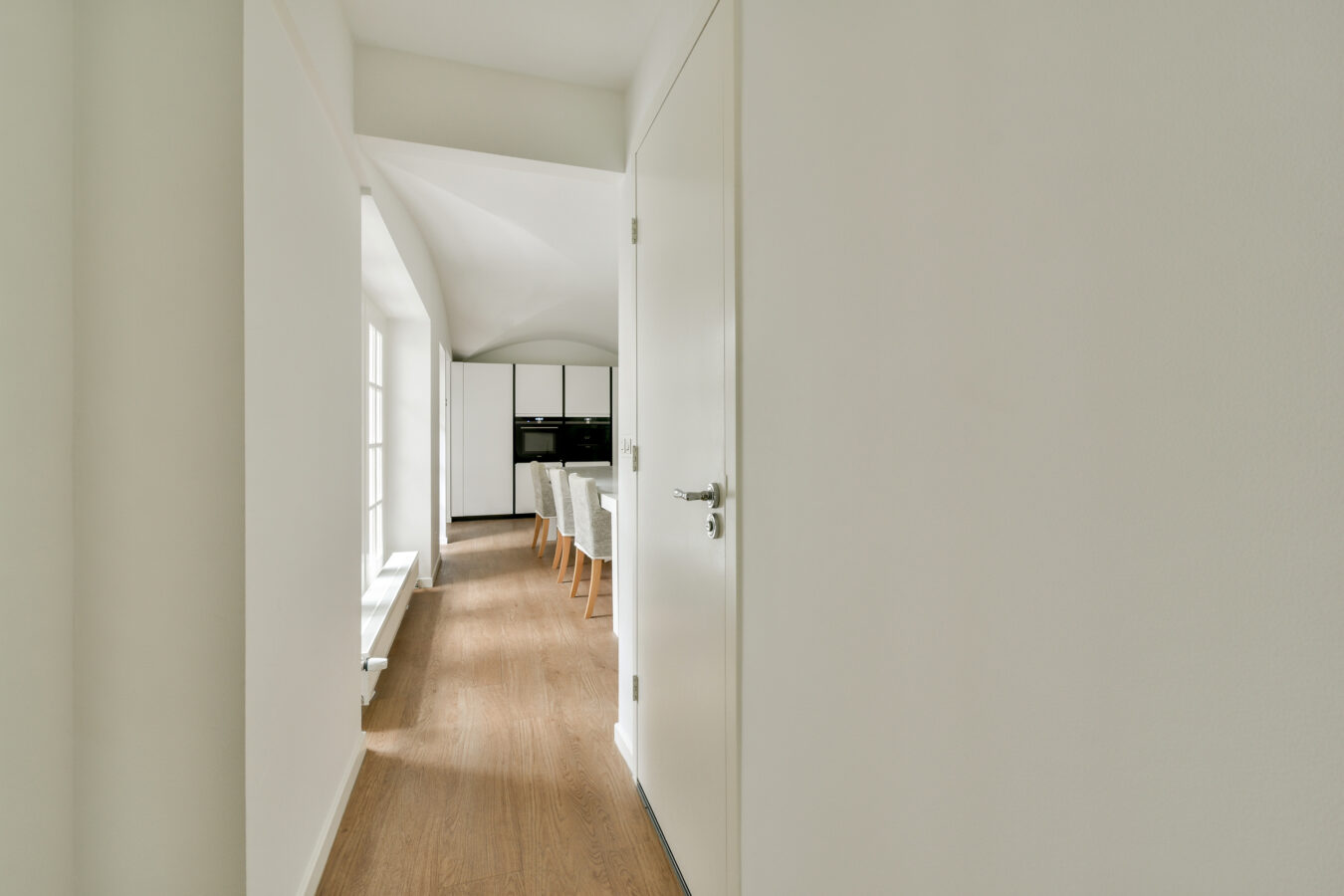Aangrenzend bevindt zich een berging met ruimte voor wasmachine, droger en de cv-installatie, evenals extra opbergruimte. Het gastentoilet met fontein is stijlvol afgewerkt. De semi-open keuken is voorzien van moderne apparatuur, waaronder een quooker, inductiekookplaat, vaatwasser en koel-vriescombinatie. Vanuit de keuken heeft u toegang tot het balkon, dat ook grenst aan de ruime eetkamer.