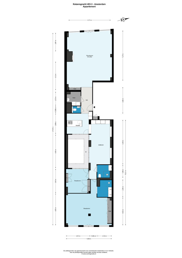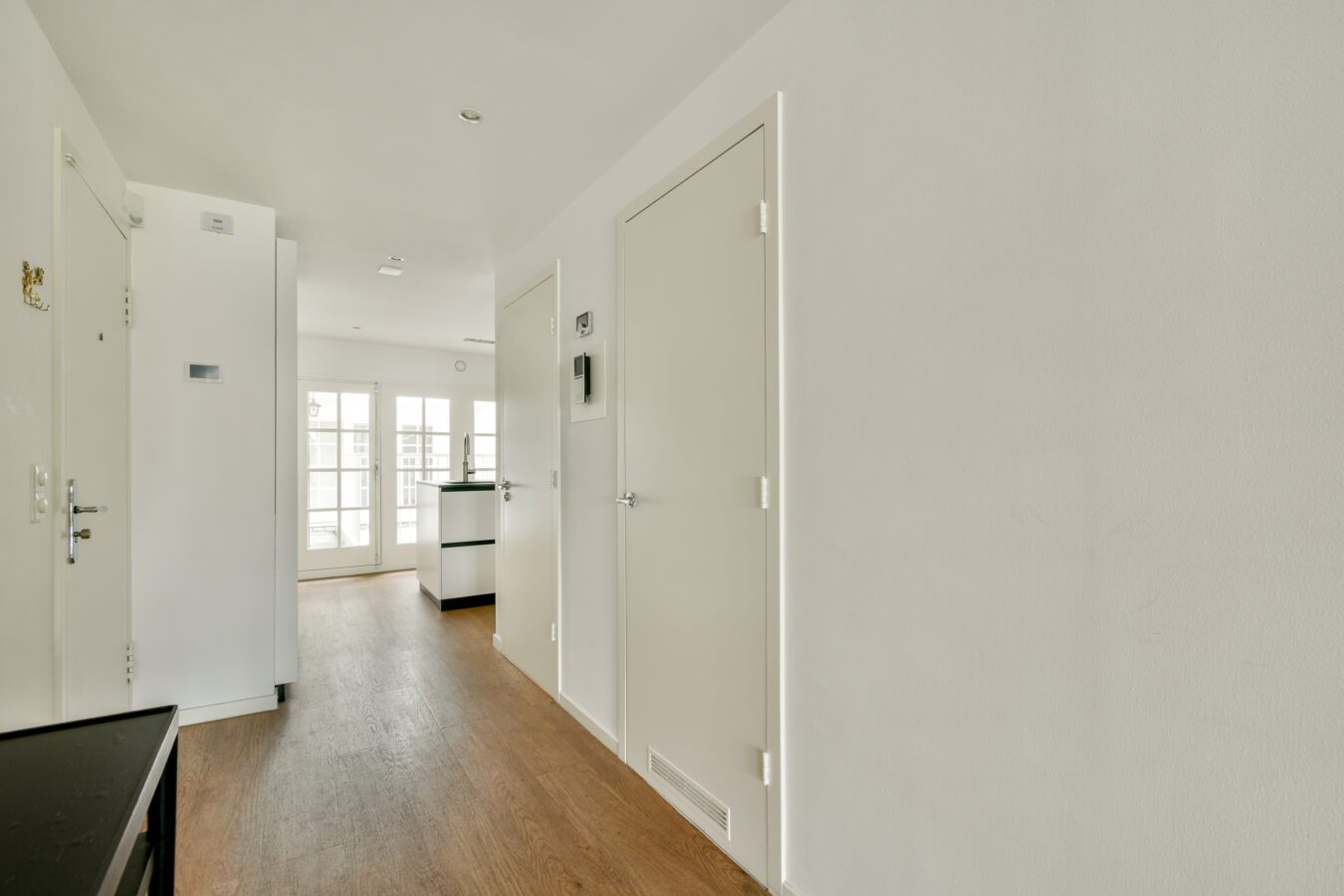 De statige entree aan de gracht geeft toegang tot de gemeenschappelijke hal. Met de lift of via de trap bereikt u de entree op de derde verdieping. Eigen hal met meterkast en toegang tot de woning. Aan de voorzijde bevindt zich de lichte woonkamer met twee grote ramen en openslaande deuren, waardoor u kunt genieten van een schitterend uitzicht over de Keizersgracht. De woonkamer is voorzien van een sfeervolle open haard en handige inbouwkasten.