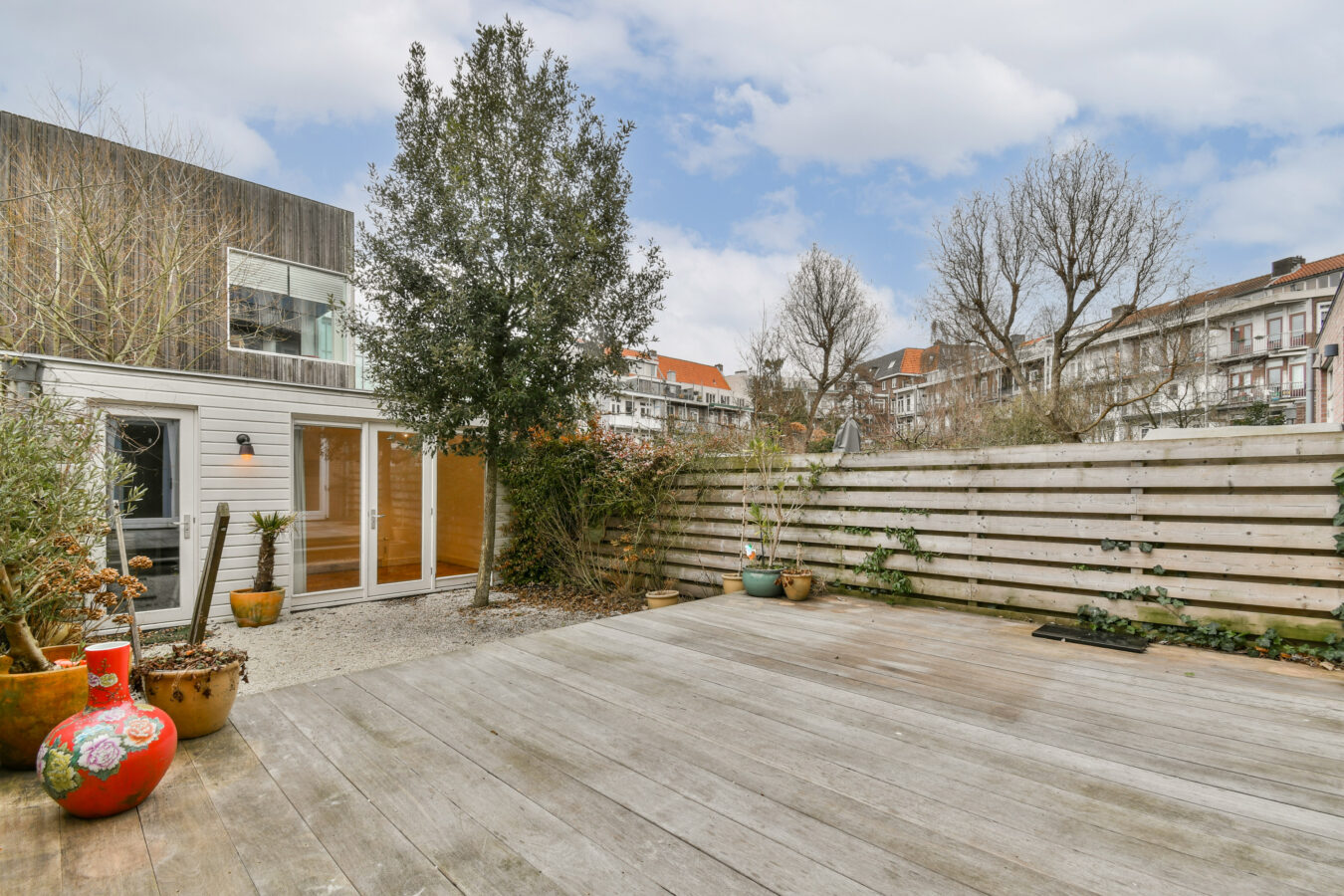 De zonnige tuin is royaal opgezet met een terras van bankirai en achterin het moderne tuinhuis: perfect als extra kamer, atelier of thuiskantoor.